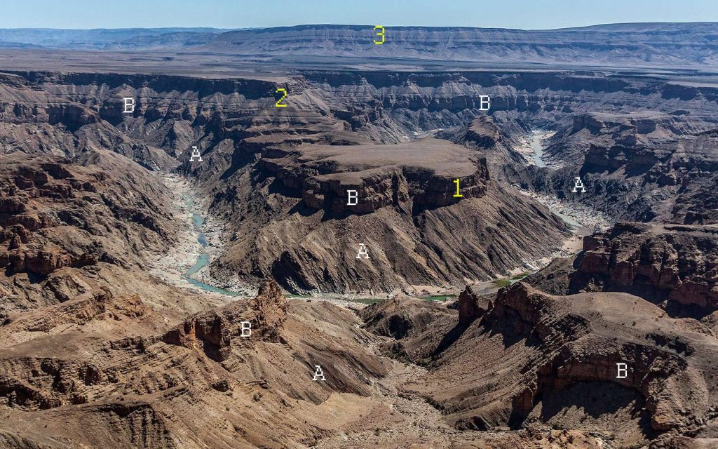 Concernant les terrains sédimentaires tabulaires (horizontaux et subhorizontaux), on y observe plusieurs ensembles étagés, les uns les autres. Le premier ensemble (1), au niveau du méandre est surmonté par un deuxième (2) au fond du méandre. Puis un troisième ensemble (3) au fond de la photo (tout à fait au sud, si l’Ouest est vers la droite…). La caractéristique de (B) c’est la présence de niveaux épais compétents (qui ressortent dans le paysage) comme en témoigne leur résistance relative à l’érosion, par rapport aux niveaux épais incompétents (qui apparaissent en «creux» dans le paysage). Les niveaux compétents, épais, sont qualifiés de barres (une barre est d’épaisseur métrique, de quelques mètres à plusieurs dizaines de mètres, et elle est formée par la superposition de bancs épais d’épaisseur décimétrique à métrique), alors que les niveaux incompétents sont qualifiés d’inter-barres (c’est-à-dire entre les barres), et elles sont, aussi, d’épaisseur métrique à décamétrique, voire hectométrique.