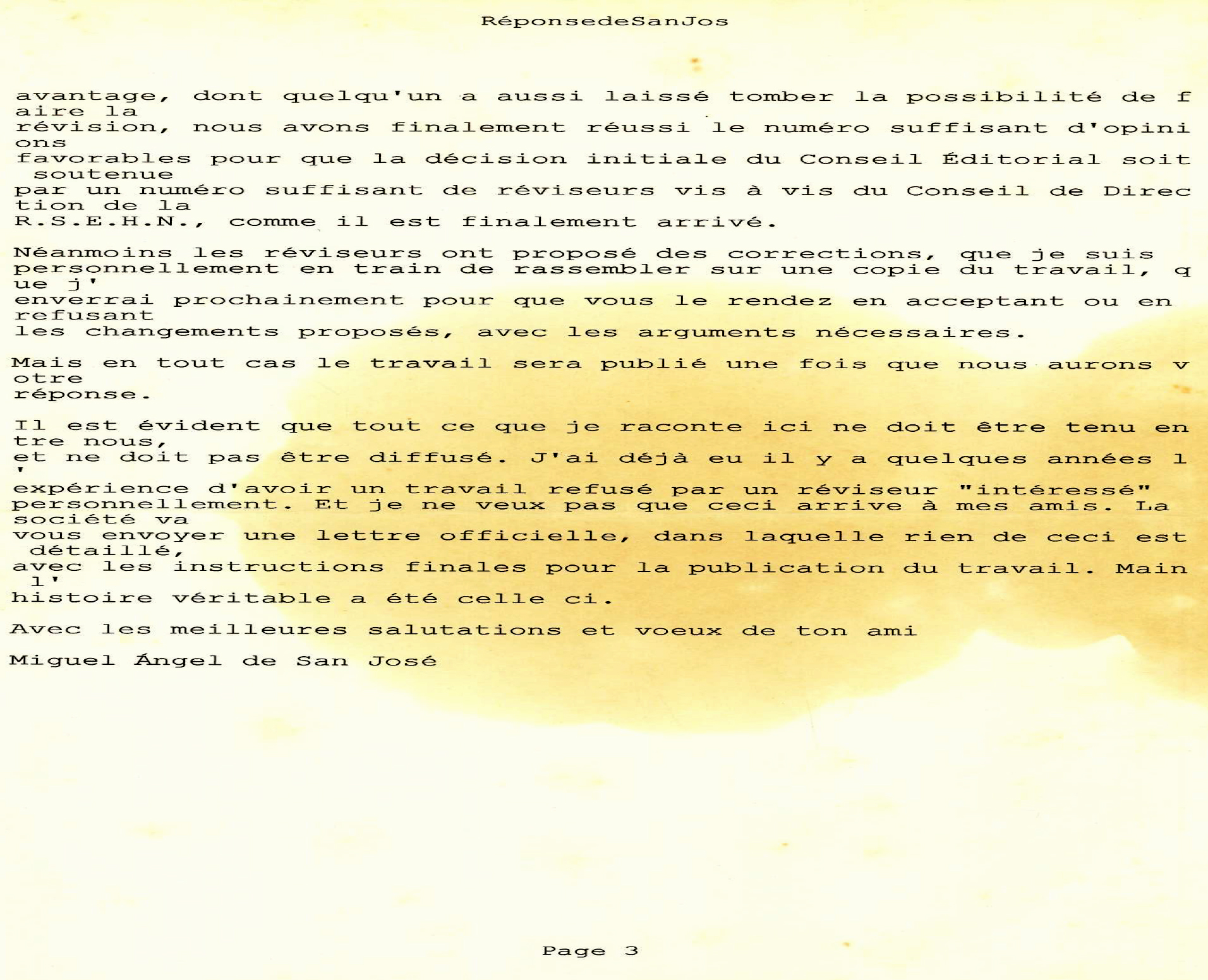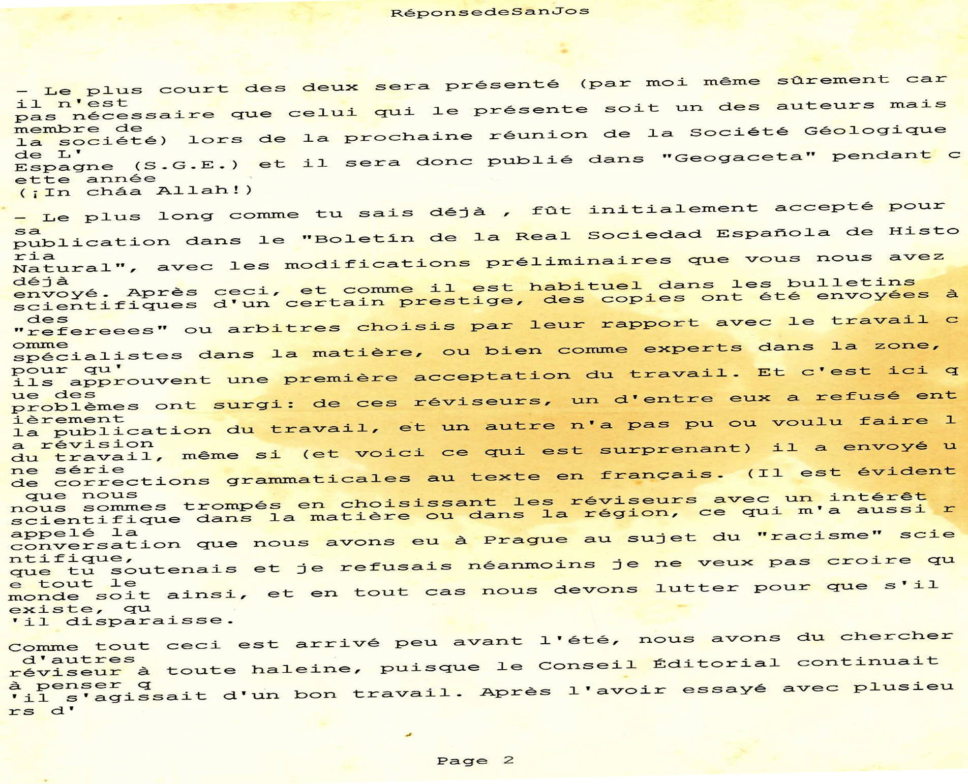 Sans entrer dans tous les détails, un de mes articles, qui n’a pas été accepté pour publication dans la revue CRAS (Compte Rendu de l’Académie des Sciences)…,a été envoyé en Espagne pour publication dans « Boletin de la Real Sociedad Espanola de Historia Natural » (RSEHN), où le staff de l’édition de la revue a donné son avis favorable pour la publication de l’article, avant même l’avis des reviewers. Néanmoins, outre les reviewers espagnols, le staff a jugé bon d’envoyer aussi cet article à deux reviewers français, vue son intérêt scientifique et son originalité, et c’est là où la crédibilité scientifique des examinateurs français a été mise à rude épreuve (voir document à l’appui, ci-joint). En effet, l’un des reviewers français « a catégoriquement refusé la publication du travail », alors que l’autre « n’a pas voulu l’examiné, alors qu’il a envoyé des corrections grammaticales du texte en français ». Le Professeur Miguel Angel De San José, de l’Université de Complutense de Madrid, qui était stupéfait d’un tel agissement de ces scientifiques français, a alors écrit au Pr. Naima Hammoumi (directrice de ma thèse) de l’Université Mohamed V de Rabat pour lui dire :« il est évident que nous nous sommes trompés en choisissant des reviewers qui ont un intérêt scientifique pour cette région, ce qui m’a rappelé la conversation que nous avons eu à Prague au sujet du « racisme » scientifique que tu soutenais et que je refusais ; néanmoins je ne veux pas croire que tout le monde soit ainsi, et en tout cas,nous devons lutter pourqu’il disparaisse, s’il existe ».
