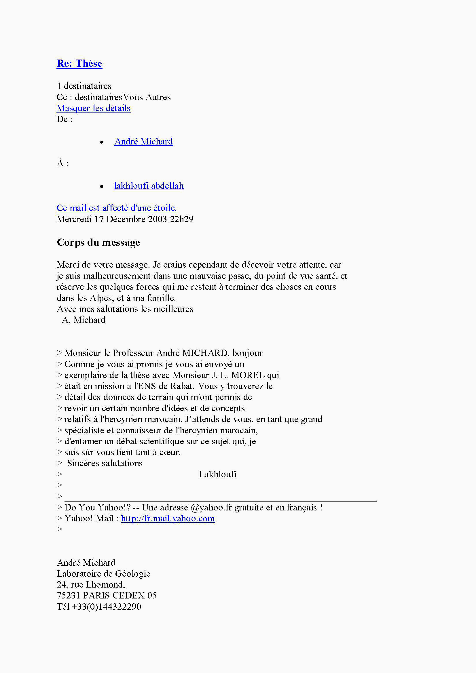 Voici la correspondance par mail entre moi et Michard, après lui avoir envoyé un exemplaire de la thèse et une copie électronique sur CD, avec le Pr. Jean Luc Morel de l’Université Paris VI.